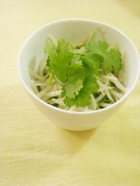②千切りしたパパイヤにかけてよく混ぜて、お好みでパクチー&ナッツ類をかけて完成。