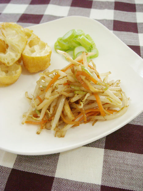 ②もやしの水気がなくなったら、人参、エリンギを入れてさらに炒める。③塩・しょう油で味付けをして、ねぎ、炒りゴマ、サラダ油(ごま油)を入れて完成です。