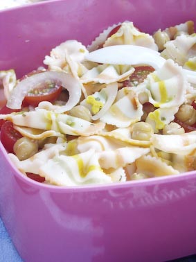 ②茹でたてのパスタとミニトマト、ひよこ豆、玉ねぎ、ドレッシング、粉チーズを合わせる。
