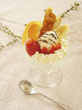 4、生クリーム、アイスと一緒に切ったフルーツを盛り付ければ完成です。